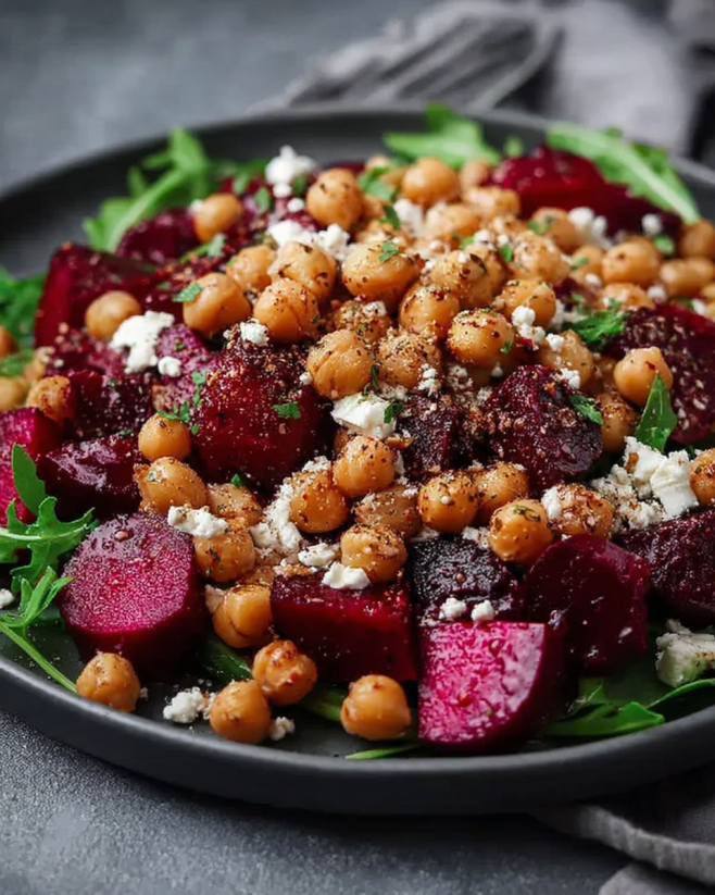These ingredients come together to create a salad that is not only tasty but also packed with nutrients. The chickpeas provide protein, while the beets are rich in vitamins. Feta cheese adds a creamy texture and a tangy flavor that balances the sweetness of the beets.
