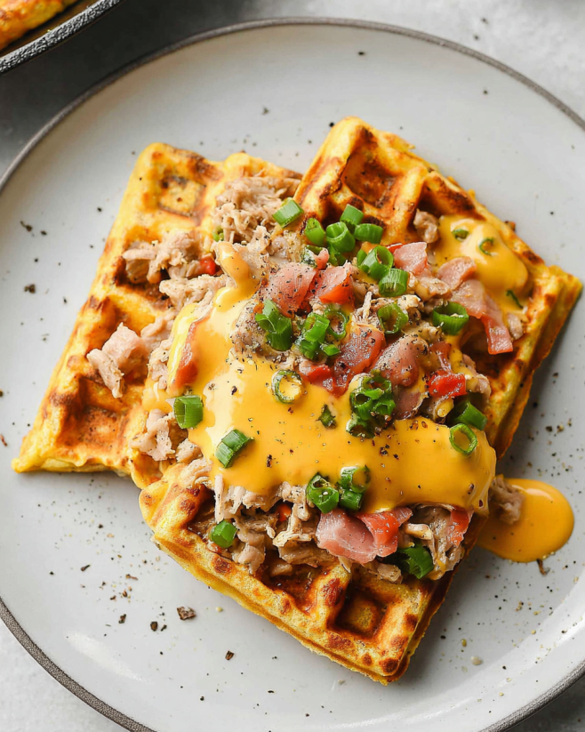 Waffle Omelet with Cheese Sauce is a must-try dish!