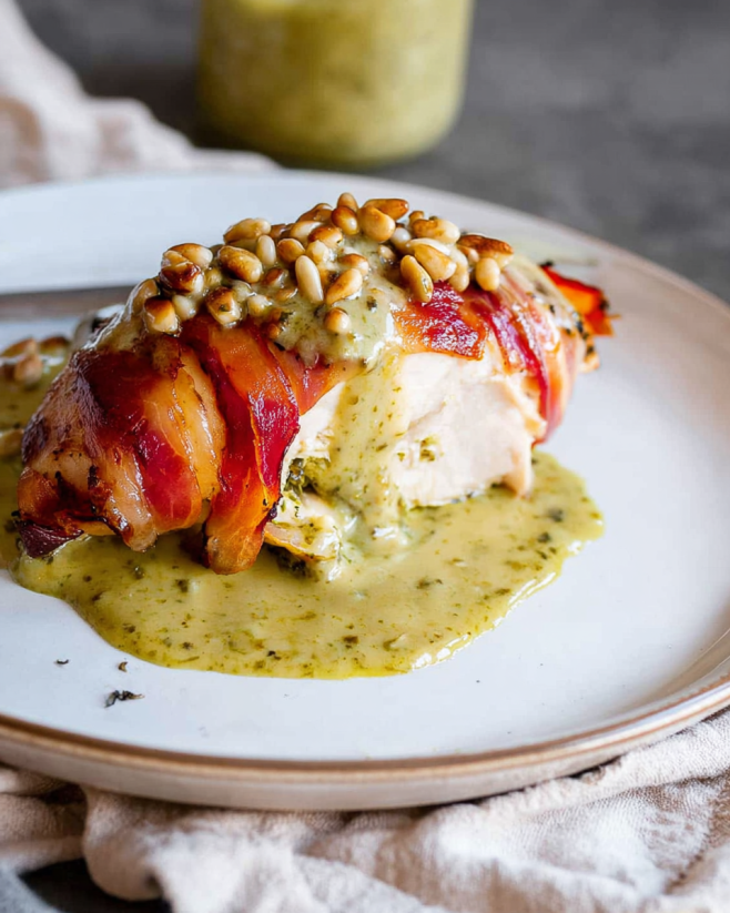 Prosciutto-Wrapped Chicken with Pesto Cream Sauce delights!
